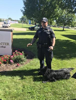 The demonstration simulates a traffic stop in the parking lot of the school. Shots fired when the driver jumps out the vehicle and then runs away. The officer is down, and he calls for backup as he wraps a bandana around his leg to make a tourniquet.